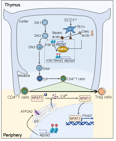 硬脂酰輔酶A去飽和酶(stearoyl CoA desaturase, SCD)是催化來(lái)源于食物或者從頭合成的飽和脂肪酸轉(zhuǎn)變?yōu)閱尾伙柡椭舅幔ㄓ退崤c棕櫚油酸)的限速酶。其中,人類基因組中的2個(gè)SCD基因均與小鼠SCD1基因高度同源。研究發(fā)現(xiàn),SCD1缺失顯著促進(jìn)小鼠外周血、淋巴結(jié)以及主要組織器官中Foxp3+ Treg的數(shù)量與比例,并賦予其抵抗自身免疫性疾病的能力,這一現(xiàn)象與SCD1缺失促進(jìn)初始CD4+ T細(xì)胞向Treg分化密切相關(guān)。利用條件性敲除小鼠、骨髓移植、胸腺移植和T細(xì)胞體外發(fā)育等體系,研究揭示SCD1在胸腺上皮細(xì)胞中的缺失是導(dǎo)致初始CD4+ T細(xì)胞向Treg的分化傾向性增加的主要原因,而非SCD1在T細(xì)胞中缺失所引起。更為重要的是,胸腺上皮細(xì)胞油酸的可利用性影響初始CD4+ T細(xì)胞向Treg分化潛能的關(guān)鍵窗口期是胸腺細(xì)胞DN2向DN3的發(fā)育階段。在油酸缺乏的胸腺微環(huán)境中,胸腺細(xì)胞內(nèi)表觀遺傳修飾酶DOT1L活性上調(diào),借以H3K79me2修飾促進(jìn)DN3胸腺細(xì)胞中Atp2a2基因座的染色質(zhì)開(kāi)放水平。這一表觀遺傳學(xué)印記從DN3階段一直保留至初始CD4+ T細(xì)胞,使其在接受T細(xì)胞受體激活信號(hào)時(shí),通過(guò)ATP2A2——calcium——NFAT——Foxp3信號(hào)軸促進(jìn)其向Treg分化。該項(xiàng)研究首次揭示胸腺基質(zhì)微環(huán)境中的油酸信號(hào)影響和預(yù)編程外周T細(xì)胞亞群分化偏好性的細(xì)胞與分子機(jī)制,不僅為理解不同生理病理環(huán)境中T細(xì)胞免疫調(diào)控機(jī)制提供了新視角,也為Treg的定向高效誘導(dǎo)及其在器官移植、自身免疫性疾病等治療中的應(yīng)用提供新策略與新方向。